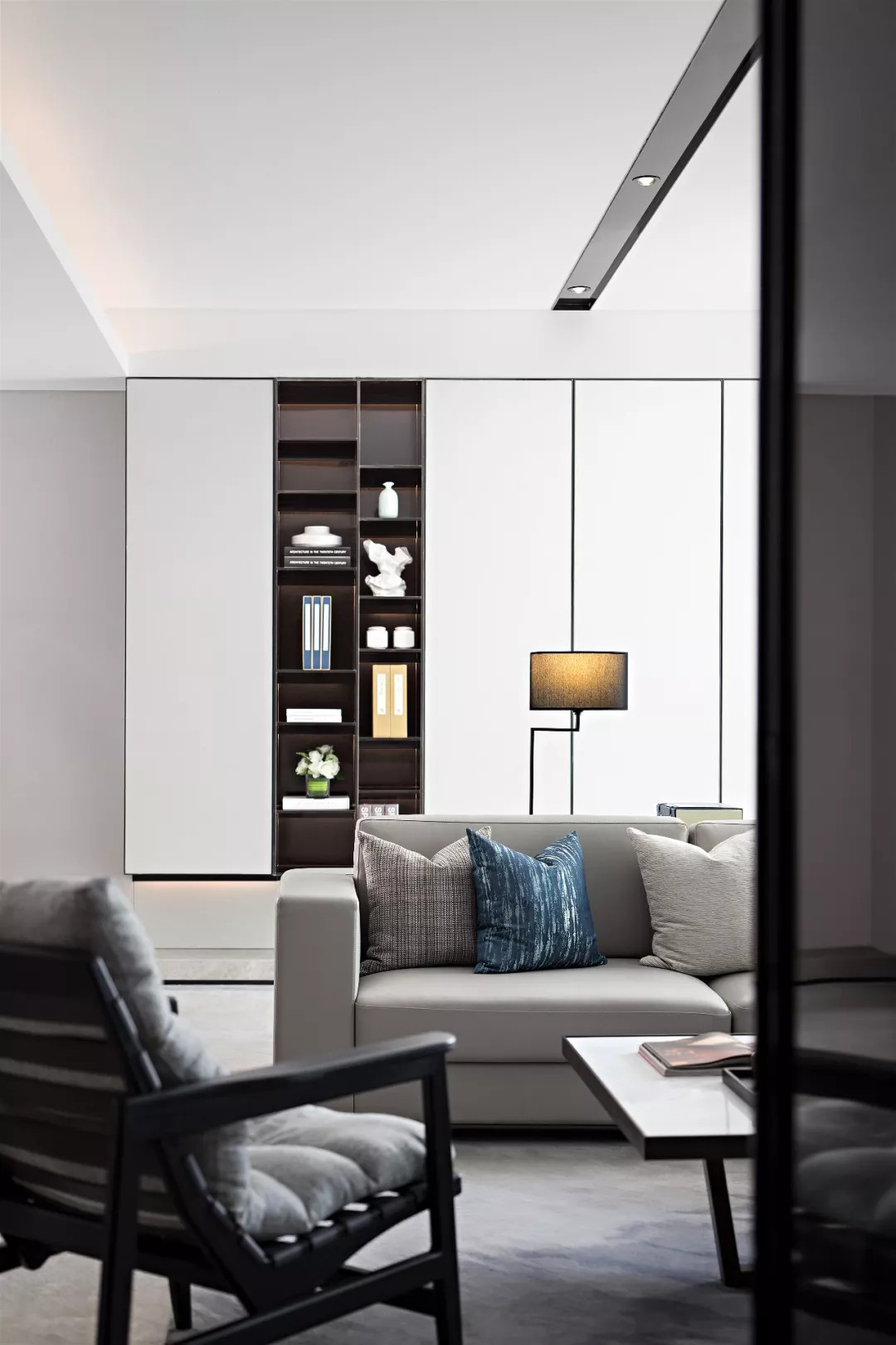 “下疊設(shè)計不以雍容華貴取勝,旨在以現(xiàn)代人的審美需求來打造東方韻味。空間以米、灰色為主,線條與塊面獨立又相近,融于整體結(jié)構(gòu)和氣質(zhì),局部跳躍藍色氤氳出寧靜感,同時也將新東方之美引至更深的境地。”設(shè)計師方磊說道。