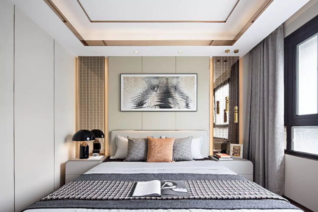 主臥延續(xù)餐廳的設(shè)計手法,古銅與皮革互補共生。金屬沖孔板、畫飾、以及搭毯紋理相呼應(yīng),加以橘色、綠色的跳躍點綴,強調(diào)空間細節(jié)的同時,也帶來時尚感。