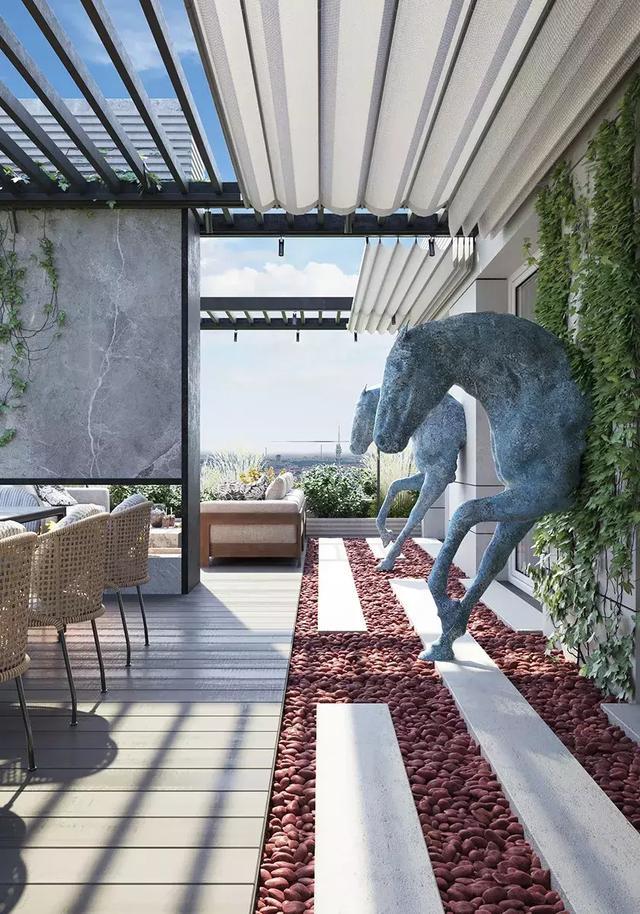 公寓還附帶一個(gè) 70 平方米的露臺,可以欣賞到城市的全景,并且有著非常特殊的裝飾主義風(fēng)格。
