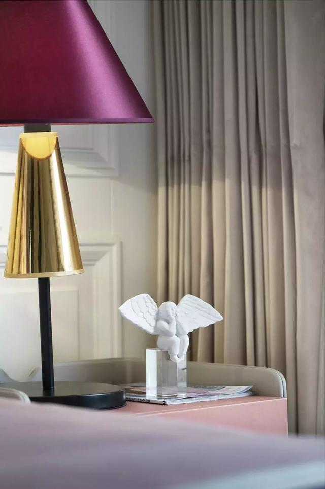 壁柜上馬賽克圖紋與藕粉色的碰撞、小燈籠似的花藝、勾勒著夢幻色彩的畫飾,含蓄的美感于其中悄然而生,輕語空間不朽的浪漫詩意。