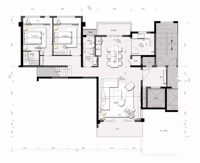 這尤見于入戶第一印象的客廳與餐廳,大空間視覺統(tǒng)一在和諧明亮的色調(diào)中,以材質(zhì)包裹下的體塊構(gòu)成,勾勒出空間的立體層次,摒棄冗雜的裝飾,極盡克制內(nèi)斂的品格。