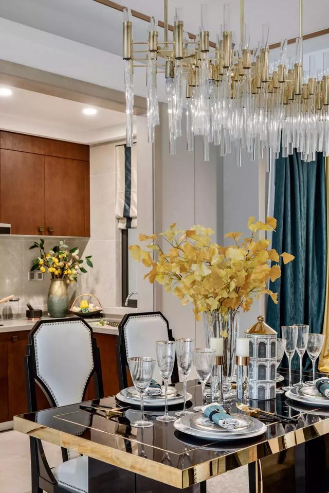 到了餐廳,空間的氣質(zhì)和格調(diào)又有了些許變化,水晶吊燈和金屬家具的加入讓奢雅范重新回歸到了舞臺(tái)中心。