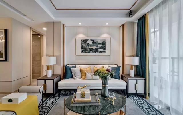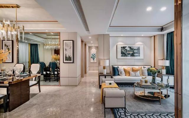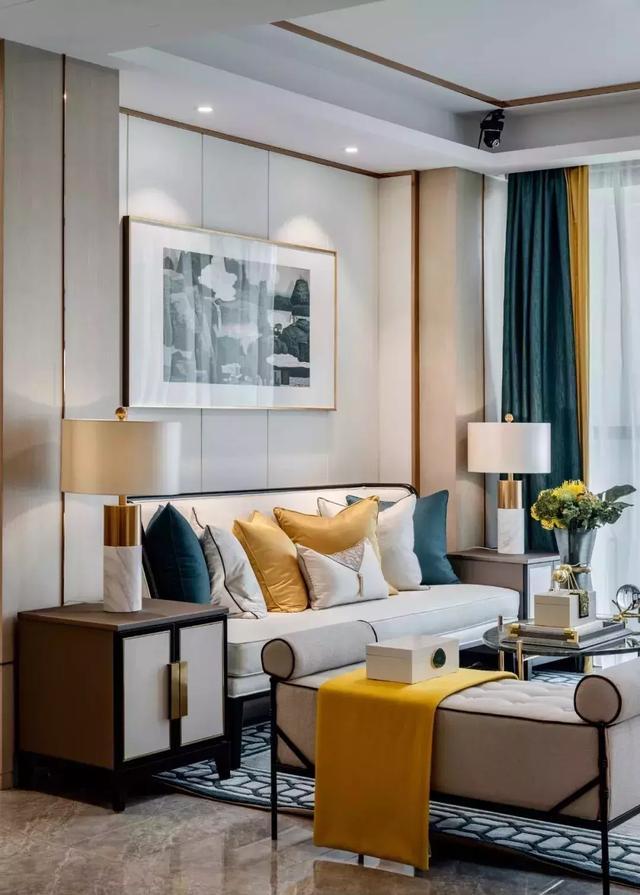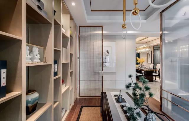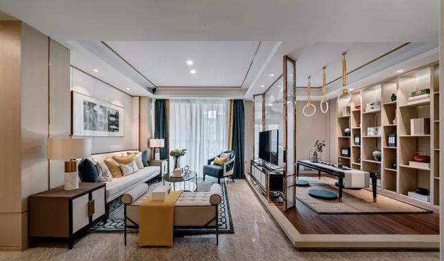 樣板房空間承襲售樓中心的奢雅范,但藍(lán)與黃的色彩組合在現(xiàn)代中式的空間里變得更為內(nèi)斂,也生發(fā)出了特有的韻味。