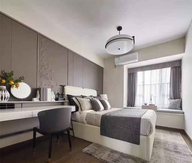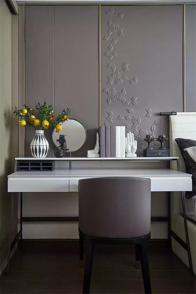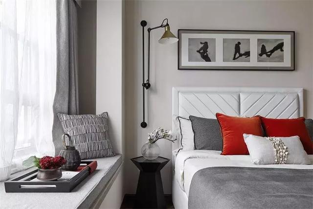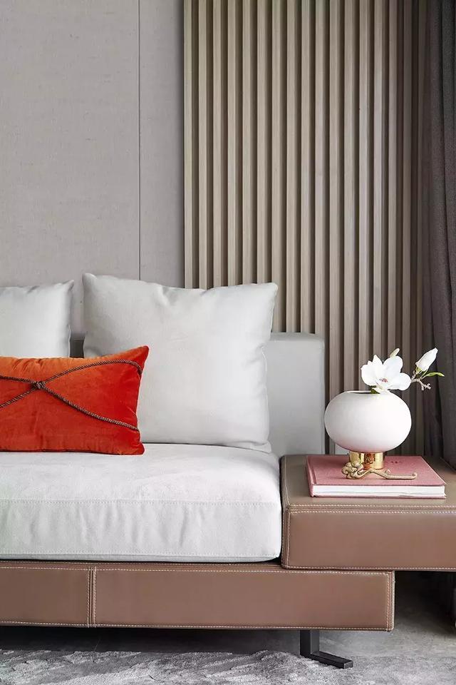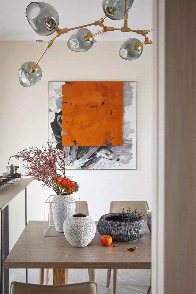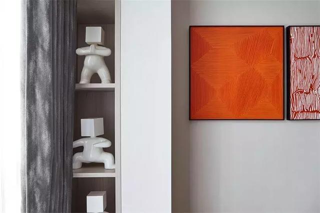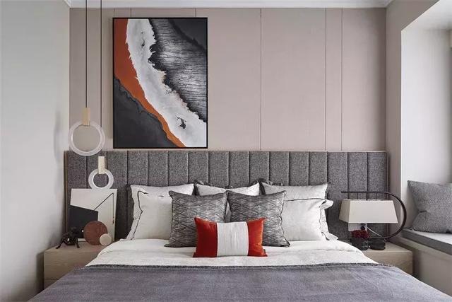 米白色、灰色、朦朧橙......這些色彩在臥室中“不期而遇”,深灰色床頭與素白色的絲光床品,極富質感的搭配,使空間多了一份理性的冷靜。墻上的掛畫為空間增添了趣味,沒有多余的花樣與紋飾,純粹的、極富現(xiàn)代感的氣息撲面而來。