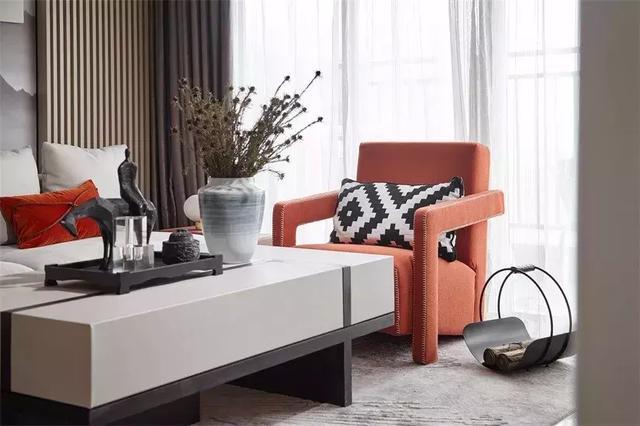 素雅的原木色與活潑的朦朧橙在空間中相互融合,一半靜謐,一半絢爛,動靜自如。大廳以棕色和素白色為主色調(diào),朦朧橙的椅子打破了這之間的沉靜,柔和的陽光透過窗紗散落在屋內(nèi),茶幾上的青銅像,每一處都呈現(xiàn)出閑適自如的生活氣息。