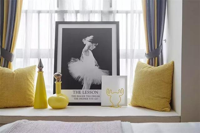 兒童房的空間中,白色是主要的基調(diào),姜黃色的床品在室內(nèi)作點綴。孩子的世界總是豐富多彩的,隨處可見的兒童擺件,和一幅穿芭蕾裙的女孩的照片,呈現(xiàn)出童真和極富藝術氣質的空間。