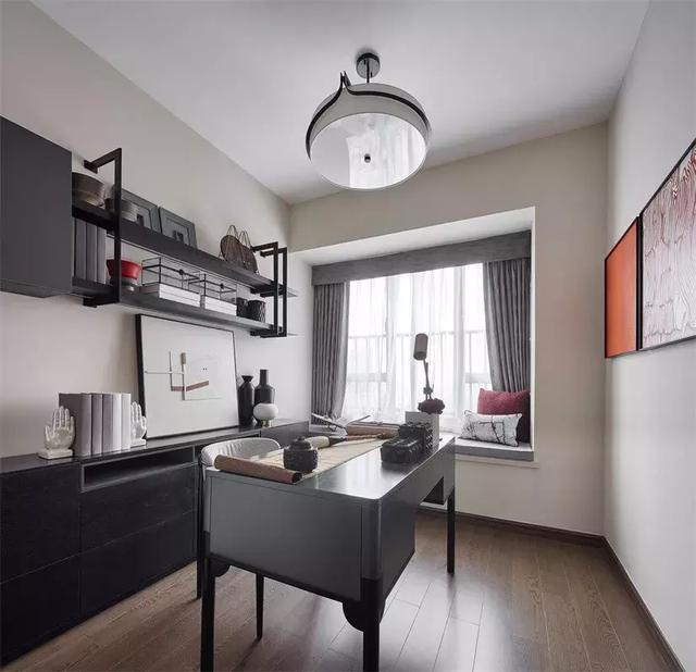 書房以黑色為主色調(diào),沉穩(wěn)內(nèi)斂,橙色的掛畫在空間中起到了點綴的作用,細微處更見品質,充滿著一股瀟灑風雅的書卷氣,一幅“室雅何須大,花香不在多”的閑適生活情境映入眼前。