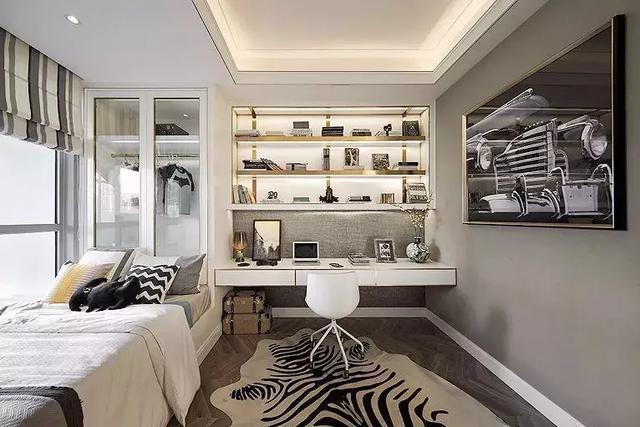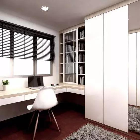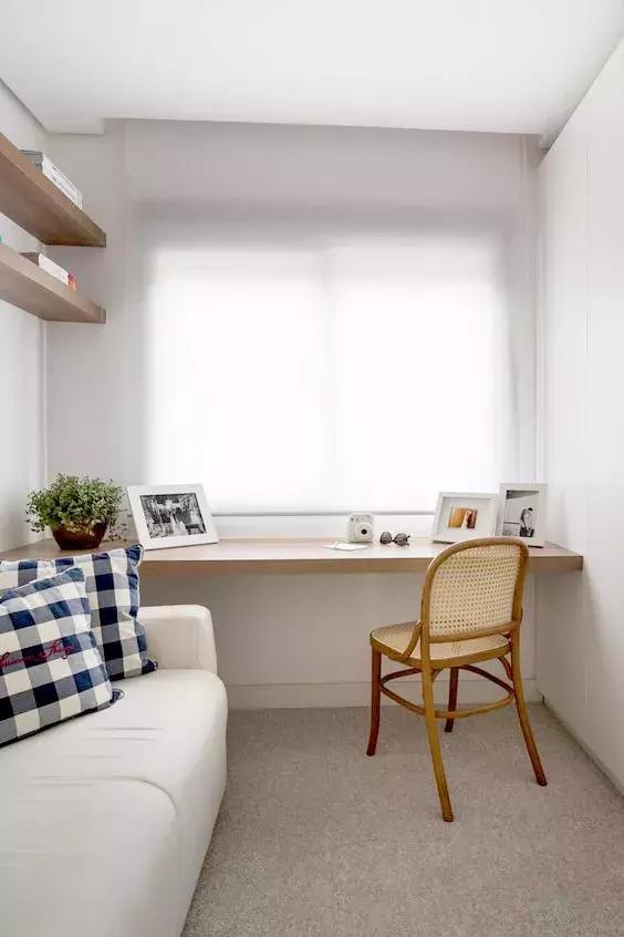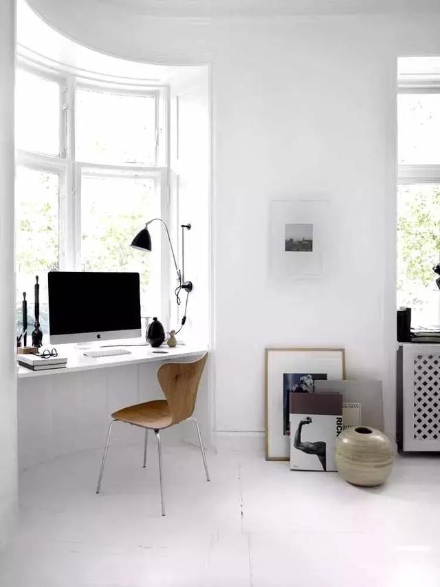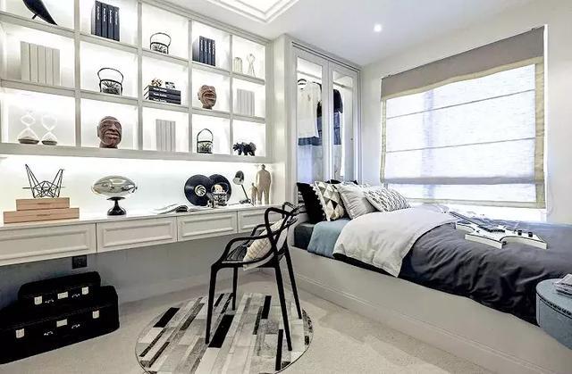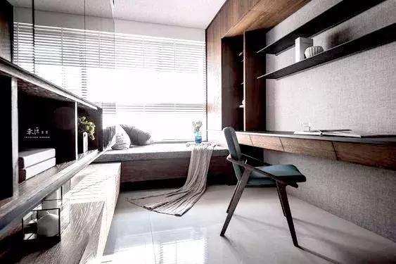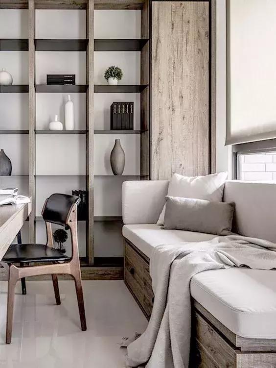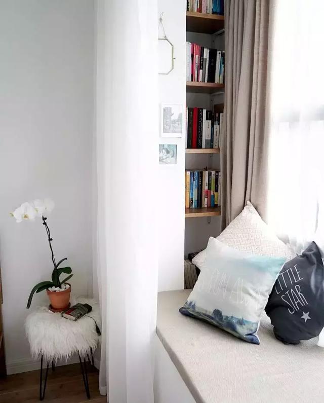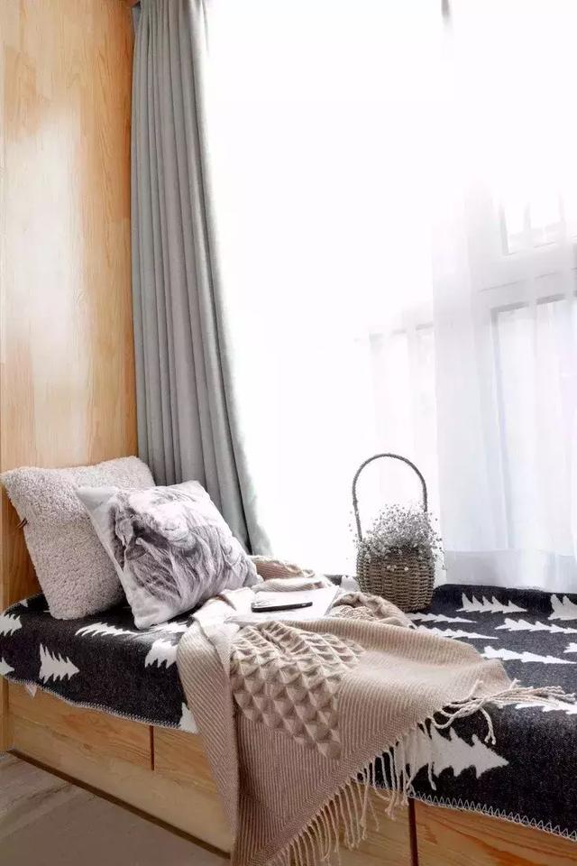 借助飄窗與床的距離,橫著擺一張書桌,想坐著躺著都很舒服,閱讀累了就看看窗外的世界,簡(jiǎn)直不要太安逸。