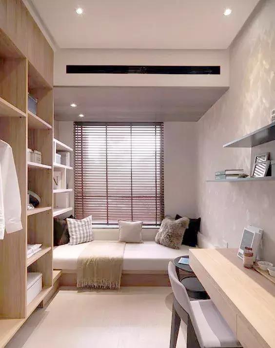 當(dāng)然,你也可以沿著窗臺(tái)順勢(shì)定制出一張舒適的床,也可以在床尾增加儲(chǔ)物柜子,既提高了空間利用率,又為自己的生活提供更多便利。