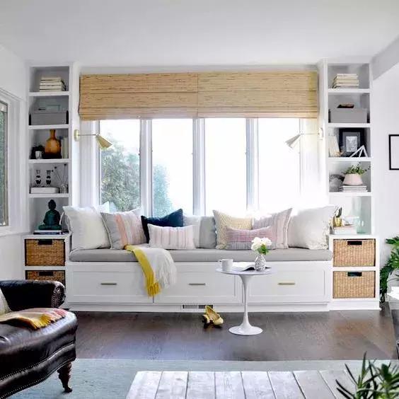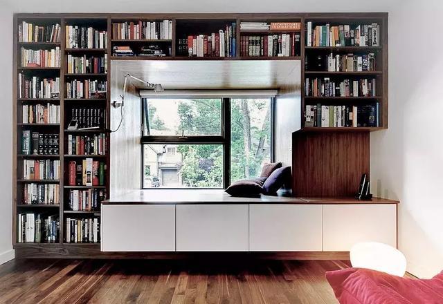 設(shè)計(jì)飄窗時(shí),可以將收納元素融合。在飄窗四周定制幾個(gè)收納的柜子,滿足對(duì)空間儲(chǔ)物的需求,在底部設(shè)計(jì)收納柜,擺上各種各樣的書籍后,既豐富了色彩層次,又“偷”出了意想不到的空間。