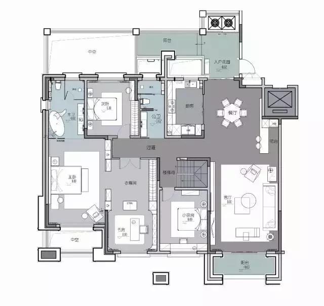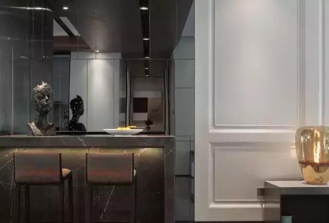 在客餐廳部分的設(shè)計(jì),設(shè)計(jì)師將吧臺(tái)的休閑功能融入,在豐富功能需求的同時(shí),增加展示性,調(diào)動(dòng)起居住者最豐富而立體的想象,讓空間的故事順暢而生動(dòng)。