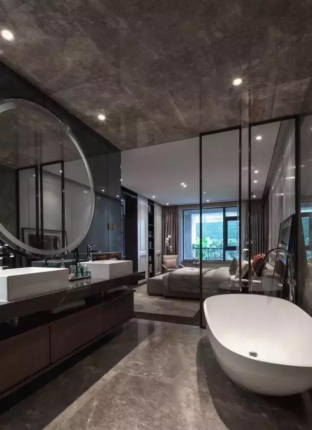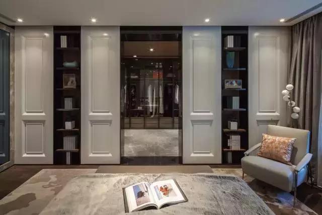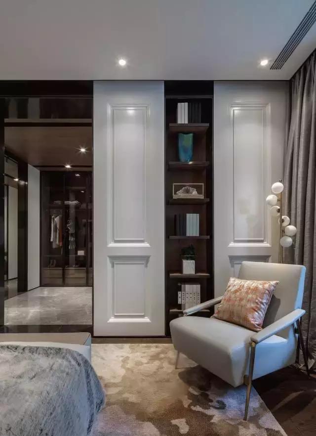 主臥中,設(shè)計(jì)師將生活轉(zhuǎn)化為極致的簡(jiǎn)潔,將原本靠南的次臥與主臥打通,形成一個(gè)大的套間,配套開(kāi)敞式衛(wèi)生間,彰顯主臥的奢華品質(zhì),同時(shí)豐富衣帽間與書(shū)房的使用功能。木色的大面積運(yùn)用,讓空間靜怡而謙和,而大理石的鋪陳又淬煉出時(shí)尚肌理和質(zhì)感。