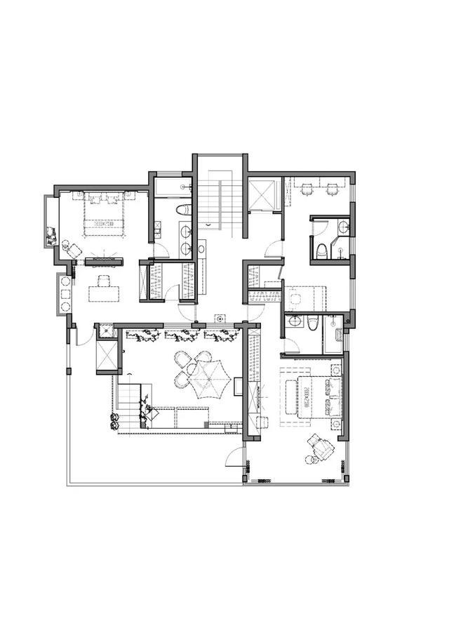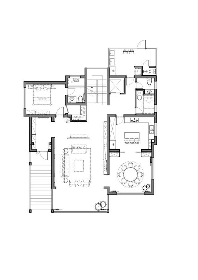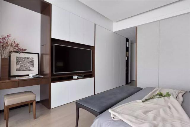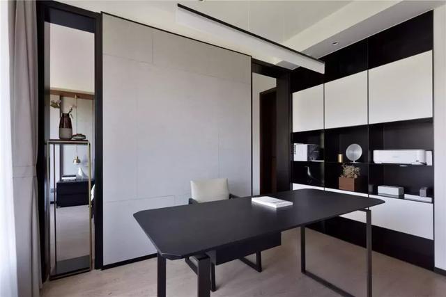 套臥打破原本臥室的封閉格局,取而代之的是書(shū)房和臥室相連的開(kāi)放空間,將材質(zhì)肌理與空間比例組合變化彼此呼應(yīng),形塑一貫的整體感。材質(zhì)方案元素在空間中組合變化貫穿于各個(gè)空間,低灰度材料對(duì)比,窄邊線條勾勒游離于界面形體之間,構(gòu)建出空間的質(zhì)感與內(nèi)斂。