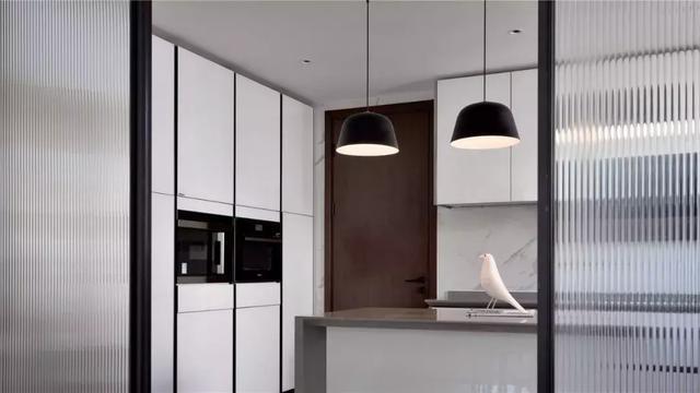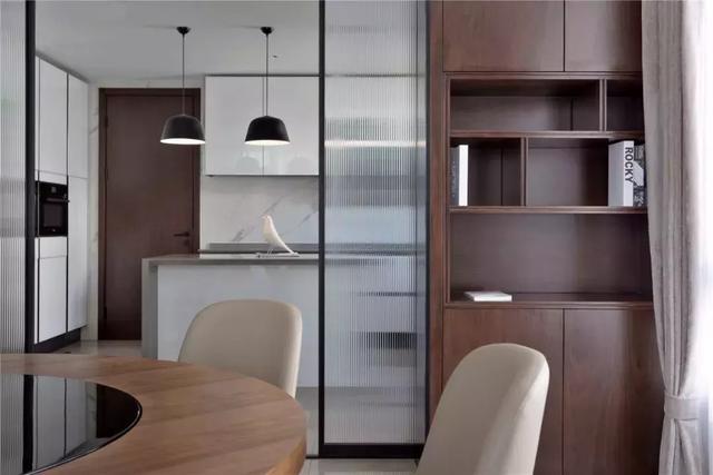 此刻,從空間角落透出餐廳的模樣,餐廳廚房一體的開(kāi)放式空間,利用移門(mén)玻璃介質(zhì)的開(kāi)合達(dá)到空間觀感的最大化,縱向紋路的玻璃朦朧質(zhì)感和低彩度的細(xì)膩木飾面材質(zhì)關(guān)系,光影變換下的明暗轉(zhuǎn)換多層次刻畫(huà)。到此,空間呈現(xiàn)為一個(gè)完整的序列。