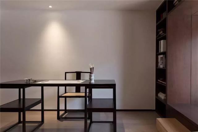書(shū)柜結(jié)合飄窗茶臺(tái),戶外庭院魚(yú)池的波光經(jīng)過(guò)竹簾伴隨自然光線的導(dǎo)入,隱若幽篁直到暗影消逝,感知時(shí)間的流逝與坦然。
