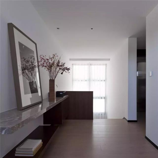 經(jīng)由樓梯來(lái)到三層空間,一簾連續(xù)的白色柔光輕盈的落在過(guò)廳里,懸挑臺(tái)面成為空間的焦點(diǎn)。