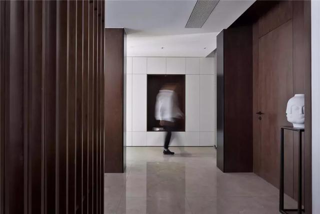 主入戶位于二層,門(mén)廳試圖通過(guò)不同材質(zhì)和顏色對(duì)比來(lái)界定空間的屬性和層次感,白色壁柜作空間背景,內(nèi)嵌壁龕為視覺(jué)焦點(diǎn)。