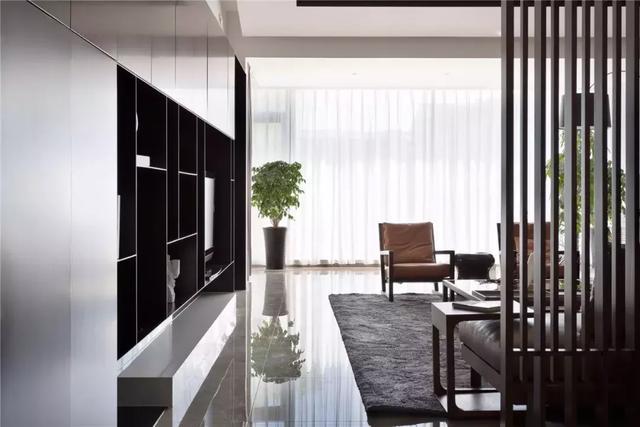 從入戶的開(kāi)始,便是利用自然光線的介入來(lái)轉(zhuǎn)換入室的情緒感受,入廳轉(zhuǎn)折后便是門(mén)廳和客廳過(guò)廊,藉由客廳沙發(fā)后的木制格柵過(guò)濾空間光線,在分隔客廳空間與入口走廊的同時(shí),也維持了空間內(nèi)通透與開(kāi)敞的氛圍,隨影入畫(huà)柔和引導(dǎo)空間的轉(zhuǎn)換。