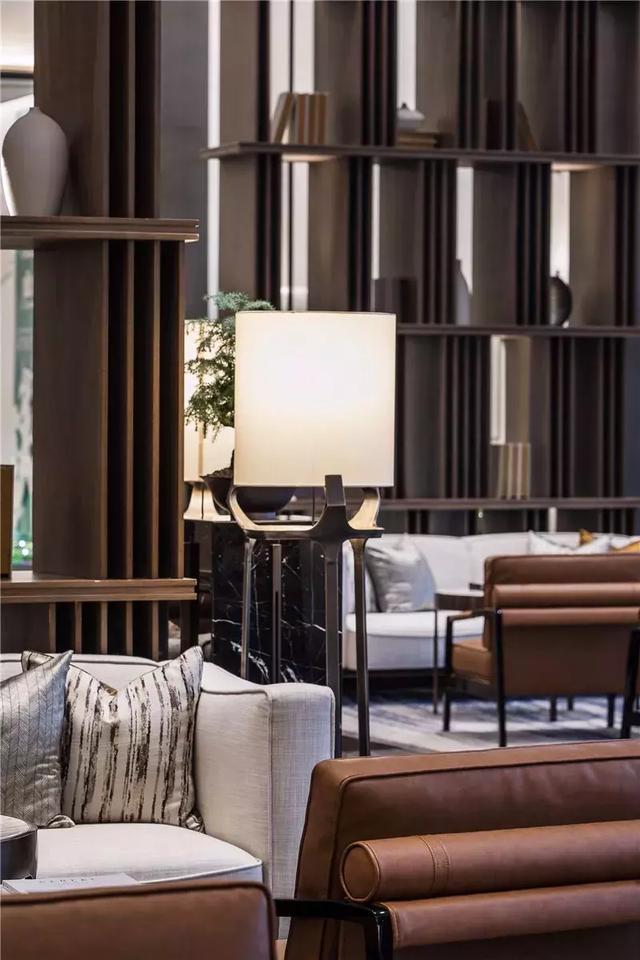 燈具和沙發(fā)皆用白色,分別以光和質感的方式形成呼應,在深色調(diào)的屏風格架的對比下,提供一種具有品質和細節(jié)感的舒適。實木框架配暖橙色皮革的沙發(fā),以舒適的坐感和細膩的手感為客人提供舒適的交流環(huán)境。加之古銅色茶幾更具視覺重量的軟裝要素,為銷售區(qū)在心理上平添了低調(diào)的信任感。
