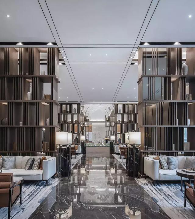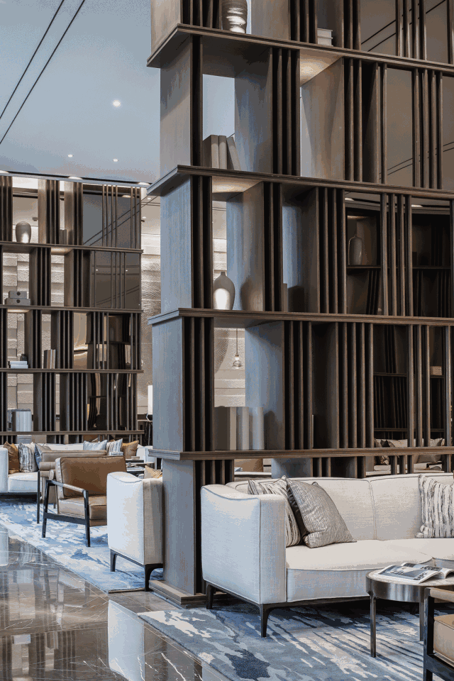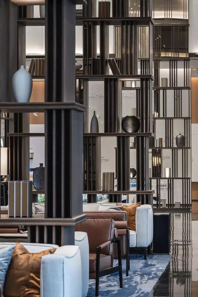 極為巧妙的“隱”的手法將原本的柱子處理成屏風的一部分,深色鏡面不銹鋼包裹后,柱子的粗笨被消解成凌厲的現(xiàn)代設計語言,完美實現(xiàn)了中軸對稱的設計初衷。