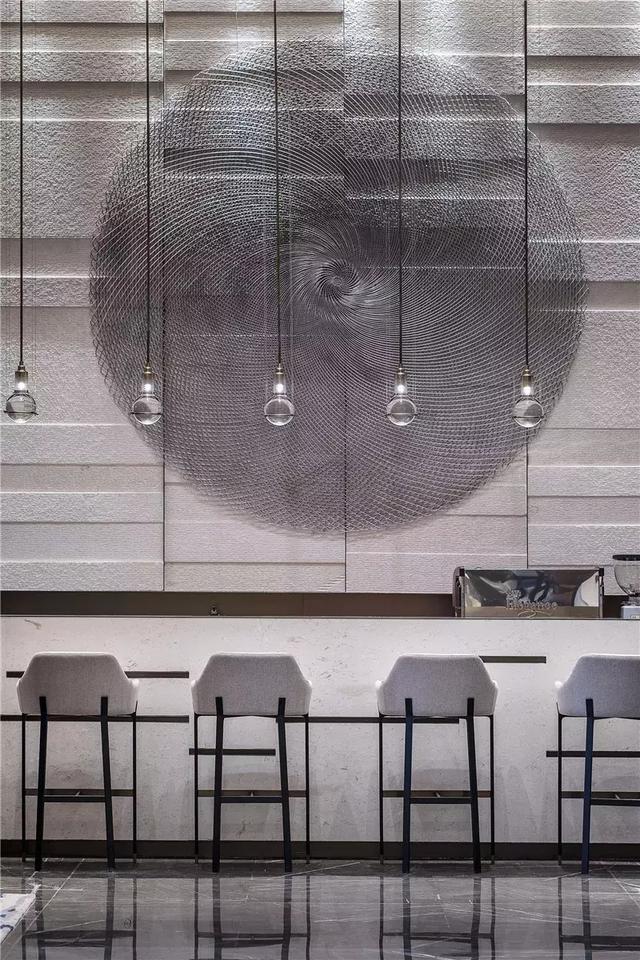 水吧臺選用雅致的白色石材為主立面,為了對沖屏風格架的復雜,背景墻以簡潔呈現(xiàn),即肌理豐富凹凸變化的墻面,融合質感獨特的手作鐵藝完成整體造型。