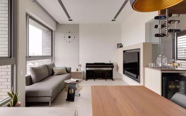放置紅酒和電器的設計,起到了很好的隔斷效果,隔而不斷,讓客廳與廚房自然過渡。