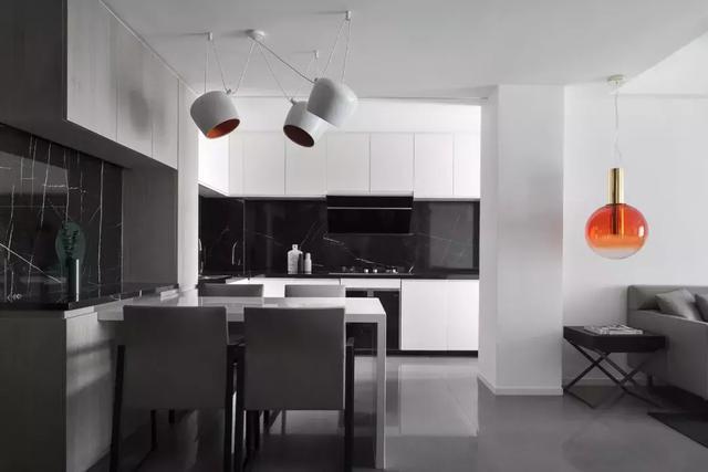 廚房的臺(tái)面與墻面運(yùn)用了黑色的大理石,對(duì)比強(qiáng)烈,豐富了空間的層次感。