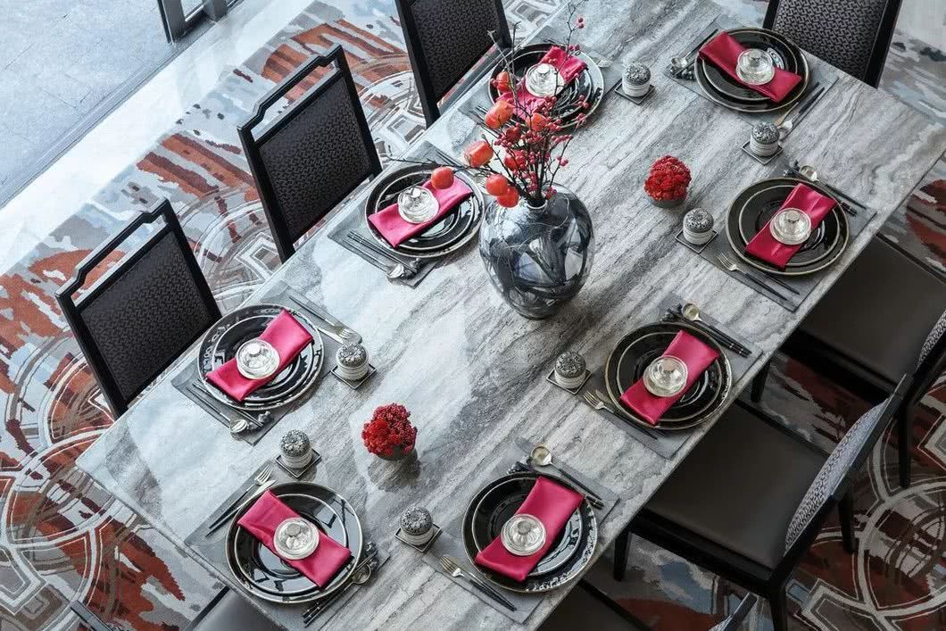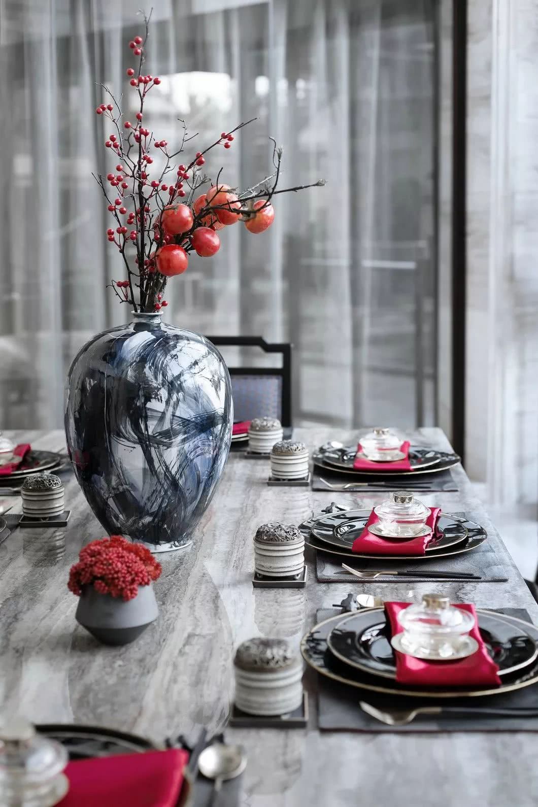步入餐廳強烈的視覺感受,尊貴而熱烈的色彩,莊重典雅的氣韻流動其間,色彩撞擊,洋溢著激揚的復古精神卻不顯沉悶。端坐的家具造型,精湛的手工藝,以及銅錢紋地毯都代表著富貴與世享。