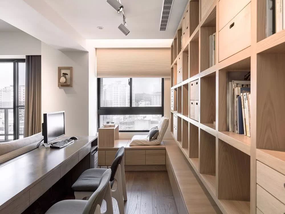 依據(jù)不同的空間屬性賦予隔斷強(qiáng)大的收納功能,實現(xiàn)一物多用,例如客廳和書房間的正面書柜墻設(shè)計,隔斷與收納完美結(jié)合,不浪費任何空間。