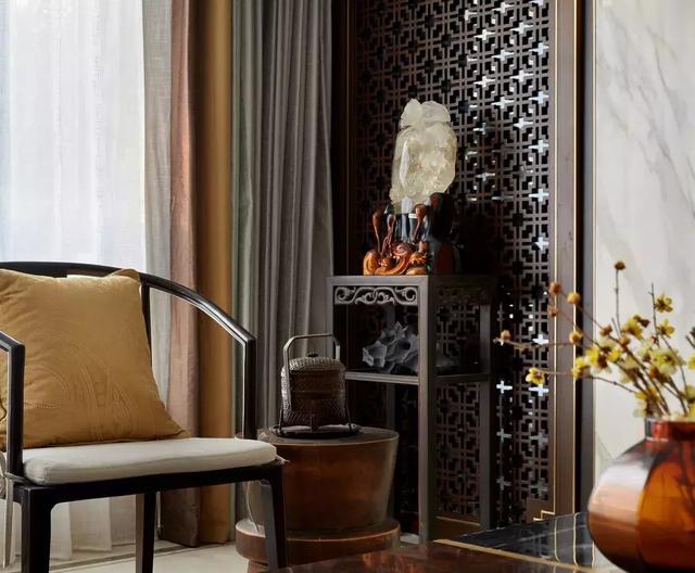 整個(gè)色調(diào)以鮮艷的杏黃和暖白色為主,再搭配穩(wěn)重的深棕色,在材料上,使用深色中式花紋格柵和白色石材營造一種成熟穩(wěn)重的空間感受。