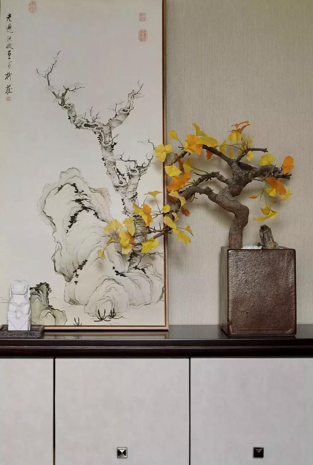 軟裝上,無論是餐廳處袁江的《梁園飛雪圖》,電視柜上山水金箔畫,還是造型考究的羅漢松盆景,都透著不俗的藝術(shù)審美的眼光。