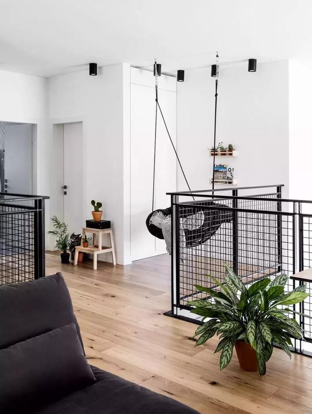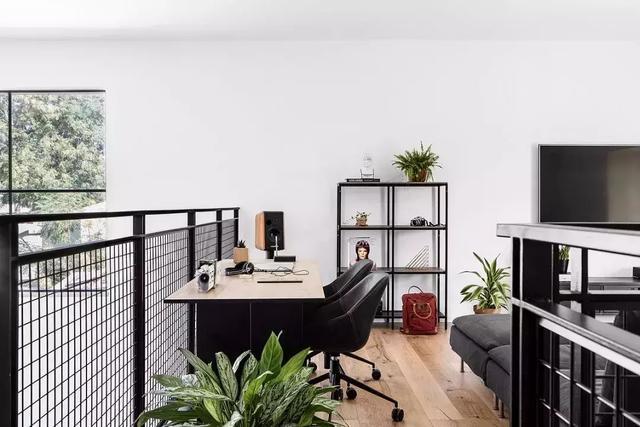 加入木質元素,調和鐵件的冰冷感,在只有單面采光條件下,公共空間采用開放式規(guī)劃,書房透光玻璃作為與客廳之間的隔間,讓光線增加全屋明亮度。