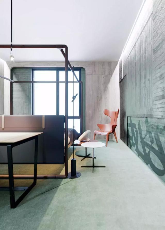 墻面斑駁感青銅仿飾漆為現場揮灑的創(chuàng)作,呈現強烈視覺效果讓工業(yè)風不流于平凡。