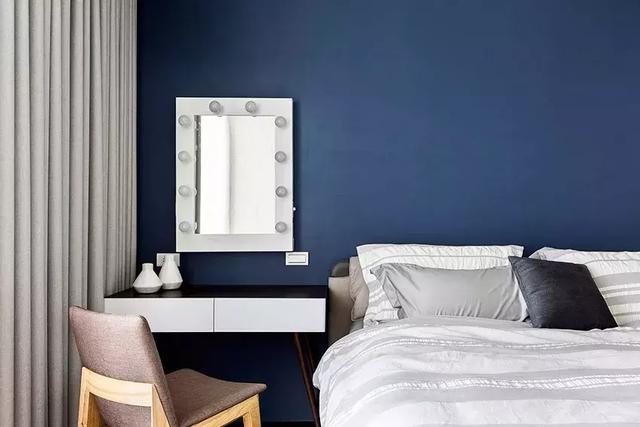 主臥空間以舒適休憩機能為主,透過沉穩(wěn)深藍墻面取代裝潢勾勒壁面的不同層次,搭配復古化妝燈鏡,點綴出屋主的優(yōu)雅情調。