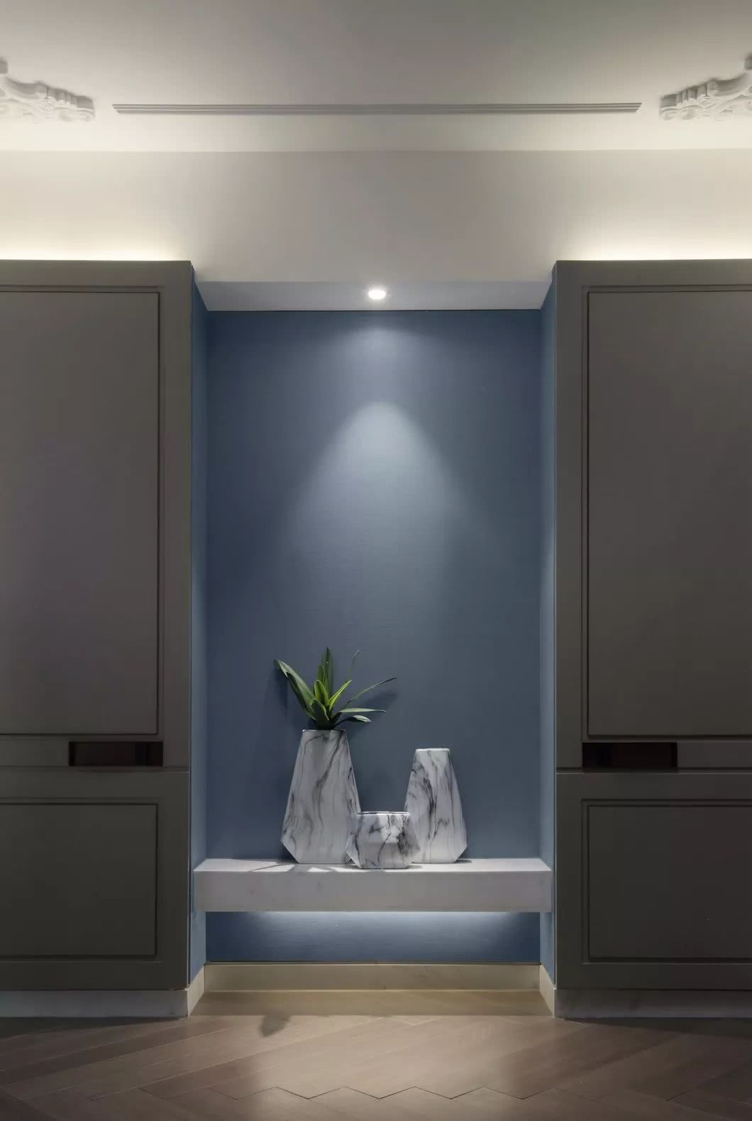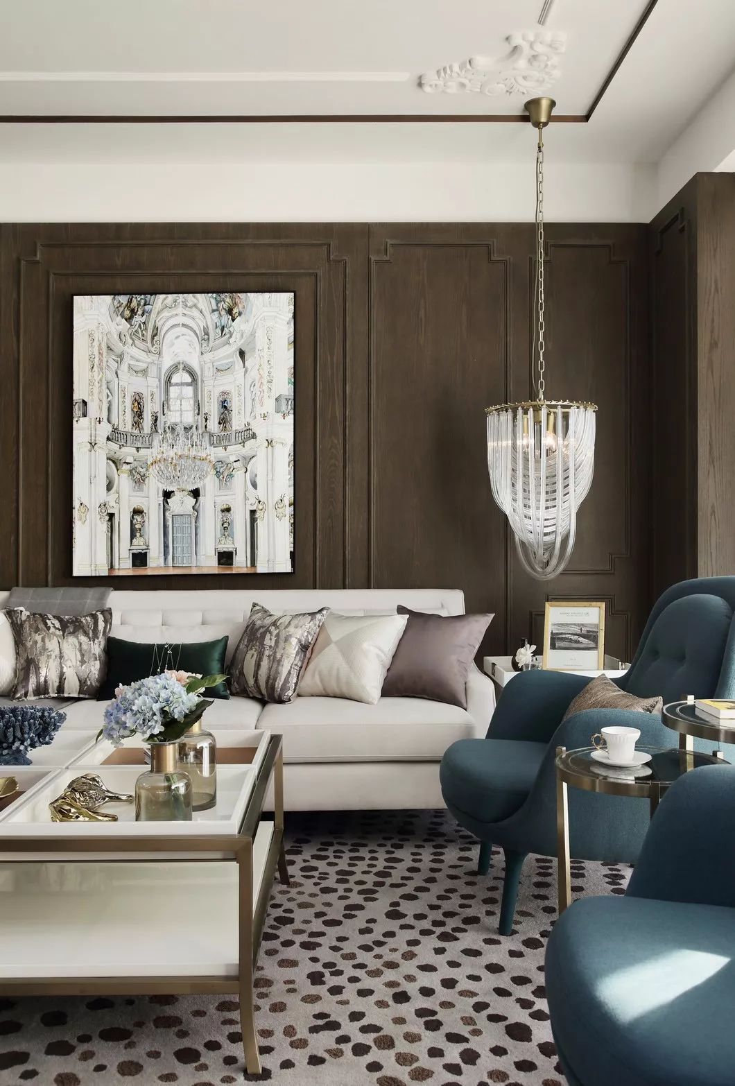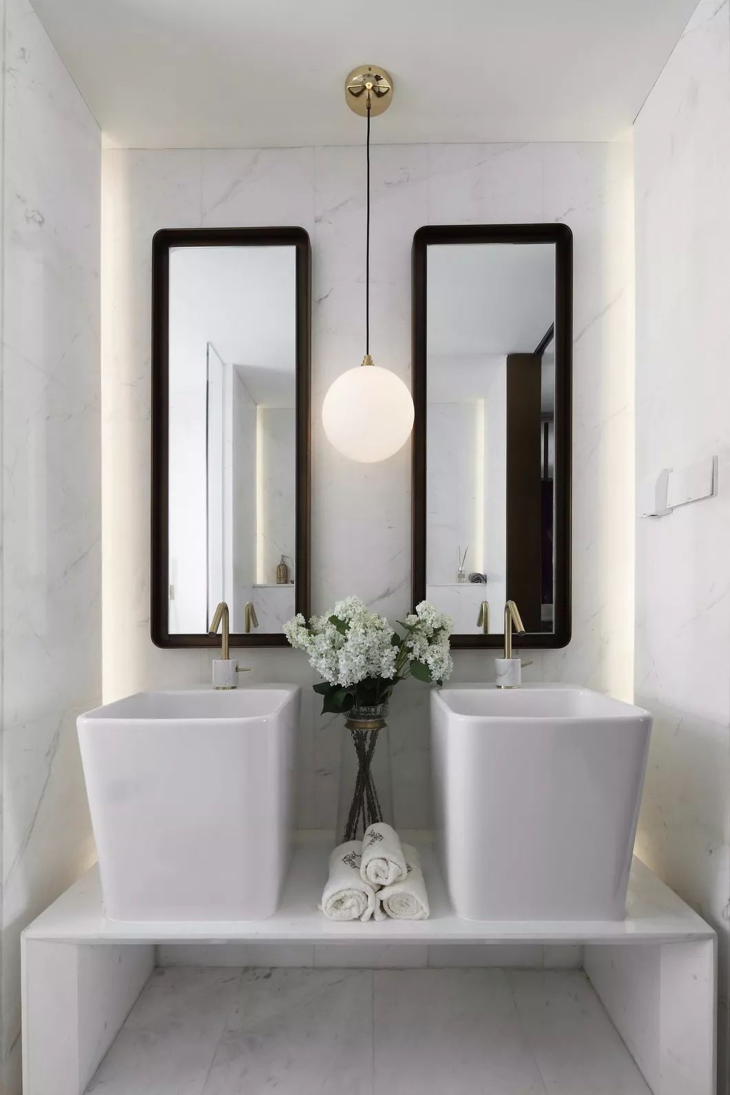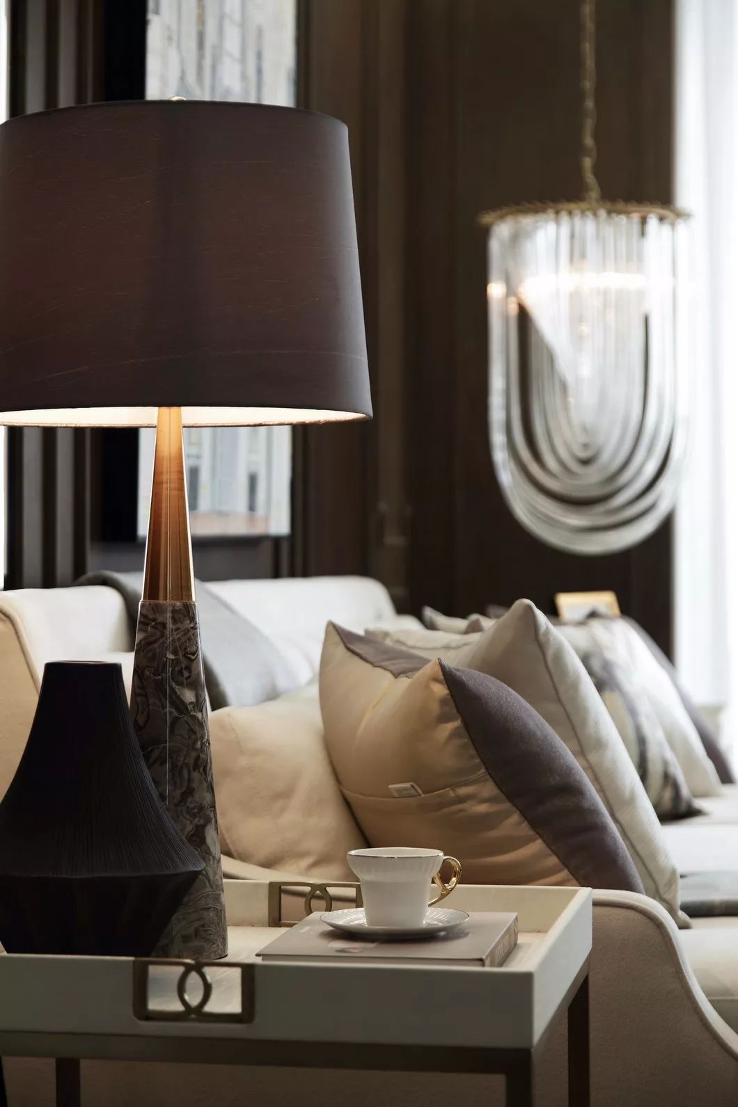 古銅色絲線和厚重典雅的大理石,纏繞羈絆于墻身犄角,不經(jīng)意間泄露出家中主人的不凡品味。似是一支時有小提琴隱沒其間的協(xié)奏曲,悠揚(yáng)在你的手邊肘間。