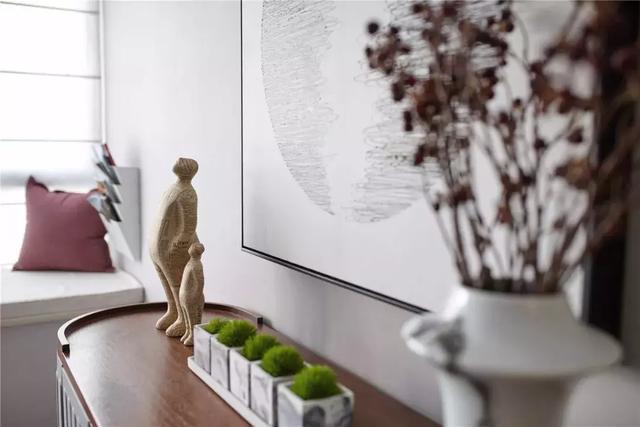 本案設(shè)計(jì)師在家具材質(zhì)上采用大量木材、棉麻等舒適材質(zhì),并展示出其帶有歲月刻痕又優(yōu)雅的紋理。色系上,則走吳胤標(biāo)志的暖木、白和灰色系,點(diǎn)綴低明度的紅色,切入空間的質(zhì)樸,能讓空間簡(jiǎn)約,素雅的空間里帶有一股簡(jiǎn)樸的氣息。