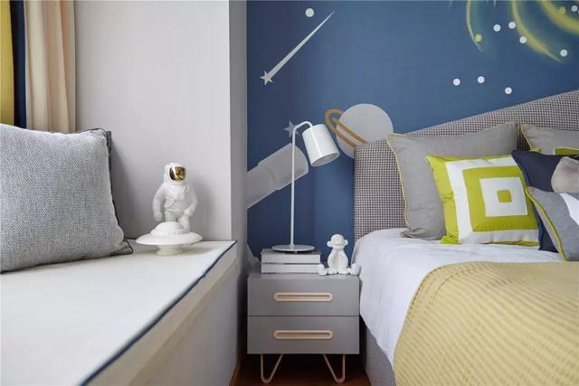 在兒童房中,窗臺(tái)上的“宇航員正在準(zhǔn)備出征”,一幅在無邊的宇宙背景墻很好的表達(dá)了小朋友強(qiáng)烈的好奇心與探索精神。