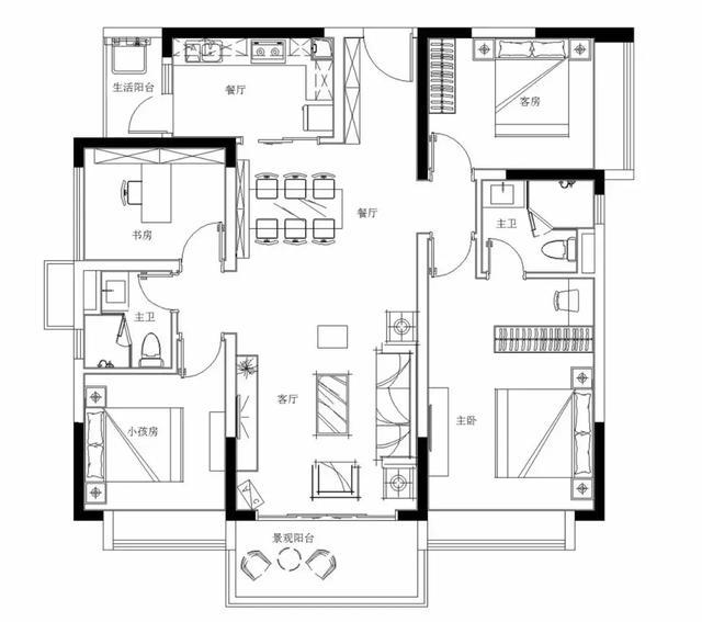 主人房摒棄一切繁復(fù)冗雜的擺設(shè),用簡(jiǎn)潔舒適的語言勾勒出生活的質(zhì)感,錯(cuò)落有致的陳設(shè)細(xì)節(jié)與空靈的祥云掛畫增添空間的藝術(shù)內(nèi)涵,完美詮釋了少即是多的現(xiàn)代主義與追求自我,返璞歸真的生活哲學(xué)。