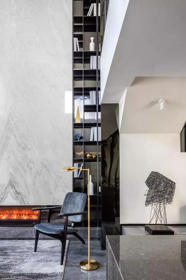 當(dāng)體驗(yàn)者身處客、餐廳區(qū)域時(shí),層高為5.5米的挑高空間頓時(shí)帶給體驗(yàn)者的是空間的開闊與震撼,其背景墻采用天然白色大理石獨(dú)有的天然紋路,通過精湛的工藝對(duì)紋手法,打造出一幅宛如江南煙雨縹緲的畫卷。而與現(xiàn)代感十足的壁爐完美結(jié)合,更是對(duì)冬季主題增加了溫暖與柔和。