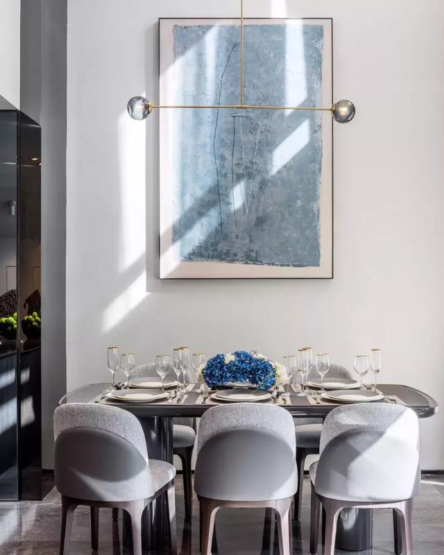 本案設(shè)計(jì)以四季之“冬”為主題,空間主體色調(diào)取自冬季的雪,被賦予陽光“冬”的暖白;結(jié)合客、餐廳中地面的灰與其后那一抹高雅的湖水墨藍(lán)色垂簾,將“冬”的緘默冷靜勾勒其中,賦予空間不同的情感……