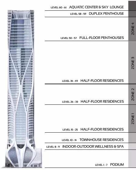 大廈的10 到 14 樓將包括聯(lián)排別墅形式性質(zhì)的公寓。半層公寓將占用 15 到 49 層,50-57層為全平層公寓,復(fù)式閣樓將位于 58 和 59 層。