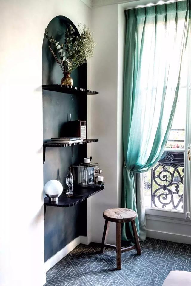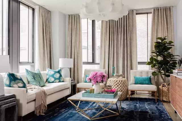 孔雀藍(lán),一種藍(lán)中帶綠的色彩,尊貴沉靜而不失生氣。在白色空間中掛起孔雀藍(lán)的窗簾,恰似海浪翻涌濺起的浪花,不拘什么形式,靈秀的風(fēng)韻總是能帶給我們?nèi)鐗?mèng)似幻的陶醉。