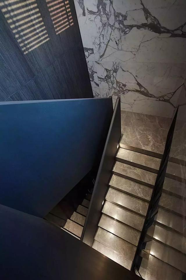 樓梯摒棄傳統(tǒng)的處理手法,扶手采用簡潔的灰藍色鋼,沉穩(wěn)而內斂,與主人的嚴謹作風相輔相成。大塊面的石材貫穿三層,空間的延續(xù)性得到很好地保證。從高處俯瞰下方,整個空間既像一個厚實的臂膀,又似一處港灣,心靈得到棲息。