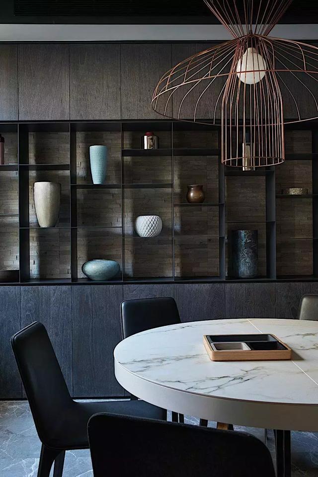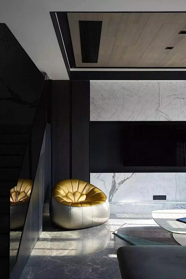 極具設計感的現代空間,搭配黑暗中透著冷冽的壁面,不經過任何處理的木皮保持天然的肌理,呈現原滋原味的美感。所有的材質本身都有自己的情緒和記憶,設計師如何巧妙地將每一種情緒記憶應用在空間中是非常重要的一件事。