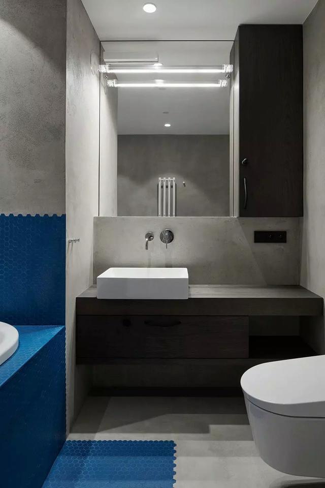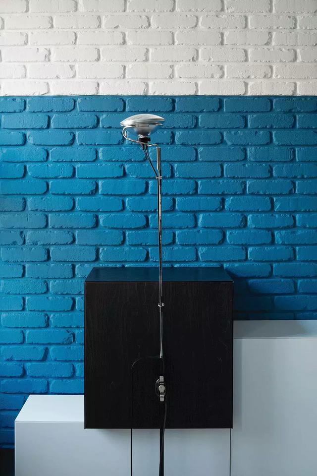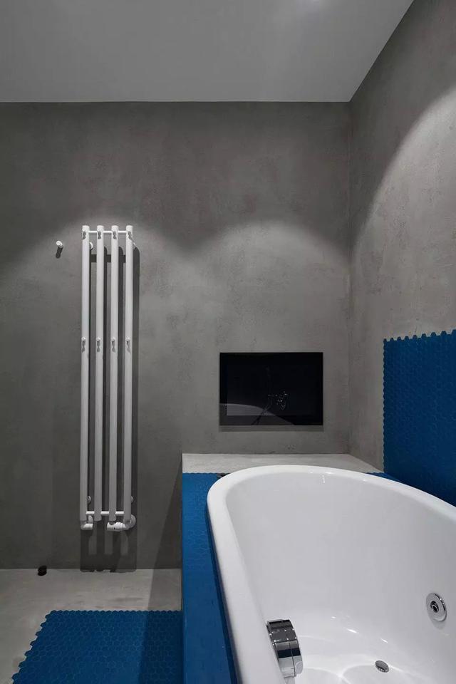 公寓以藍(lán)色作為統(tǒng)一的色調(diào)。不論是客廳的背景墻,沙發(fā),浴室中浴盆的馬賽格裝飾,以及從主臥通向主衛(wèi)的房門,均由藍(lán)色裝點(diǎn)。金屬作為工業(yè)的代表性元素重復(fù)出現(xiàn)在室內(nèi)設(shè)計(jì)的各個(gè)環(huán)節(jié)和形式中,如分割入口和起居室的滑動(dòng)門,工作臺(tái)的金屬架,以及廚房后側(cè)的金屬組合柜。
