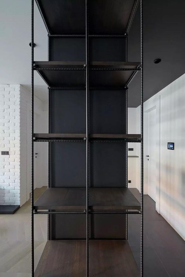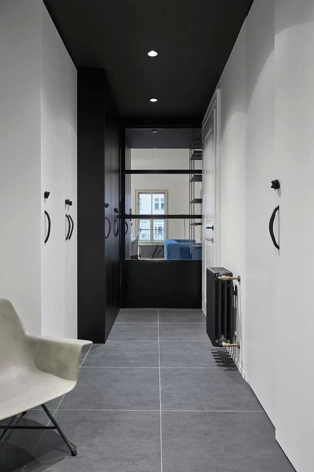 位于入口門廳向主臥通道中的黑色儲(chǔ)物柜被用于整理和存放衣服和鞋子。此外,所有廚房電器用具也安放在此。