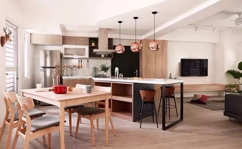 一般開放式廚房都會有吧臺,吧臺與吧椅的高度也要協(xié)調(diào)合理。