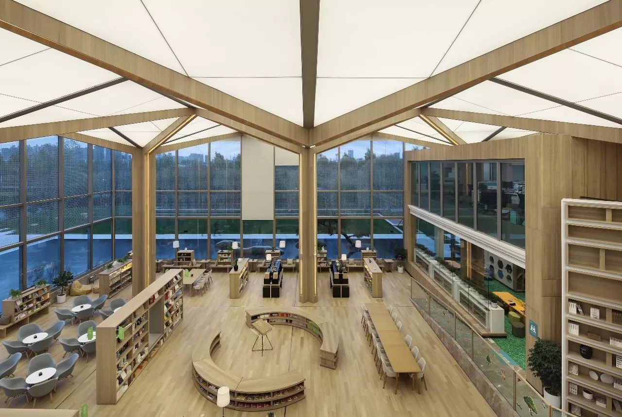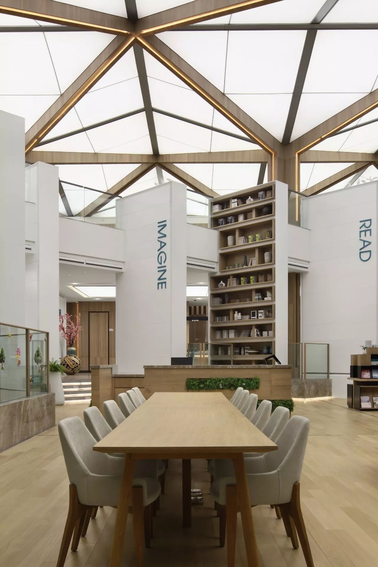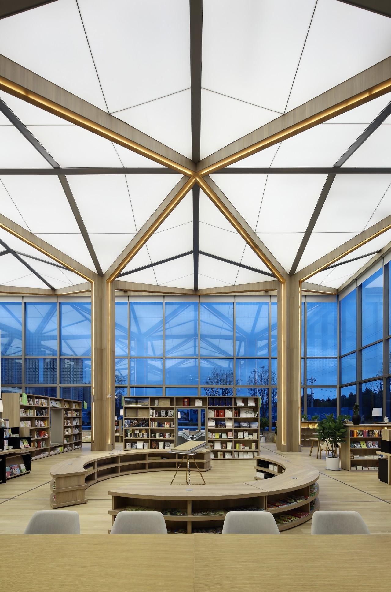 與建筑外觀一脈相承的幾何元素依然是室內(nèi)空間的主要元素,運用幾何韻律的書架、屋頂及桌椅藝術(shù)造型來塑造意境,譜寫出一派前衛(wèi)、自然、輕盈的韻律。溫潤的實木和通透的玻璃構(gòu)成視覺的主流,無論是自然光或是燈光投射,都能勾勒出如繪畫一般的光影。