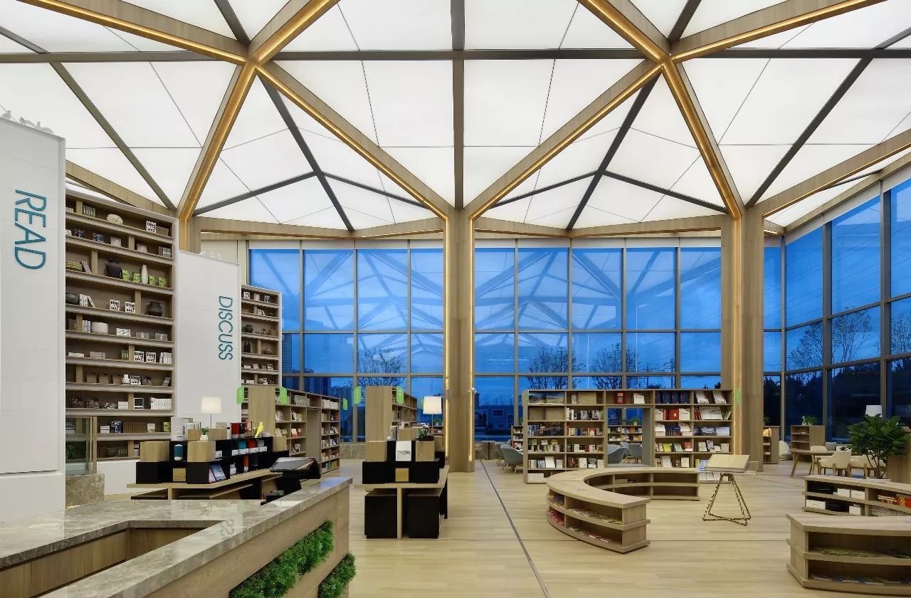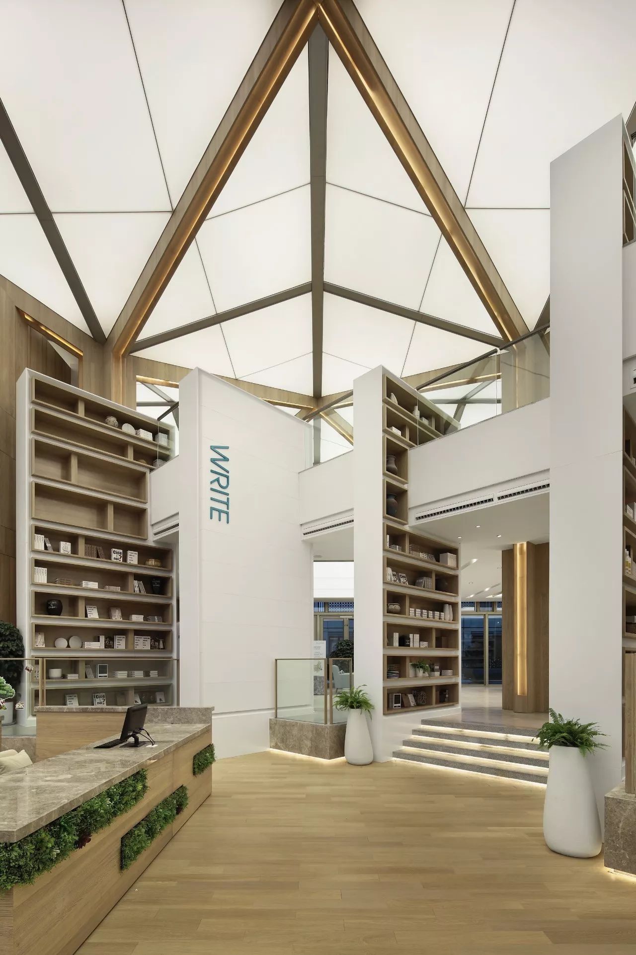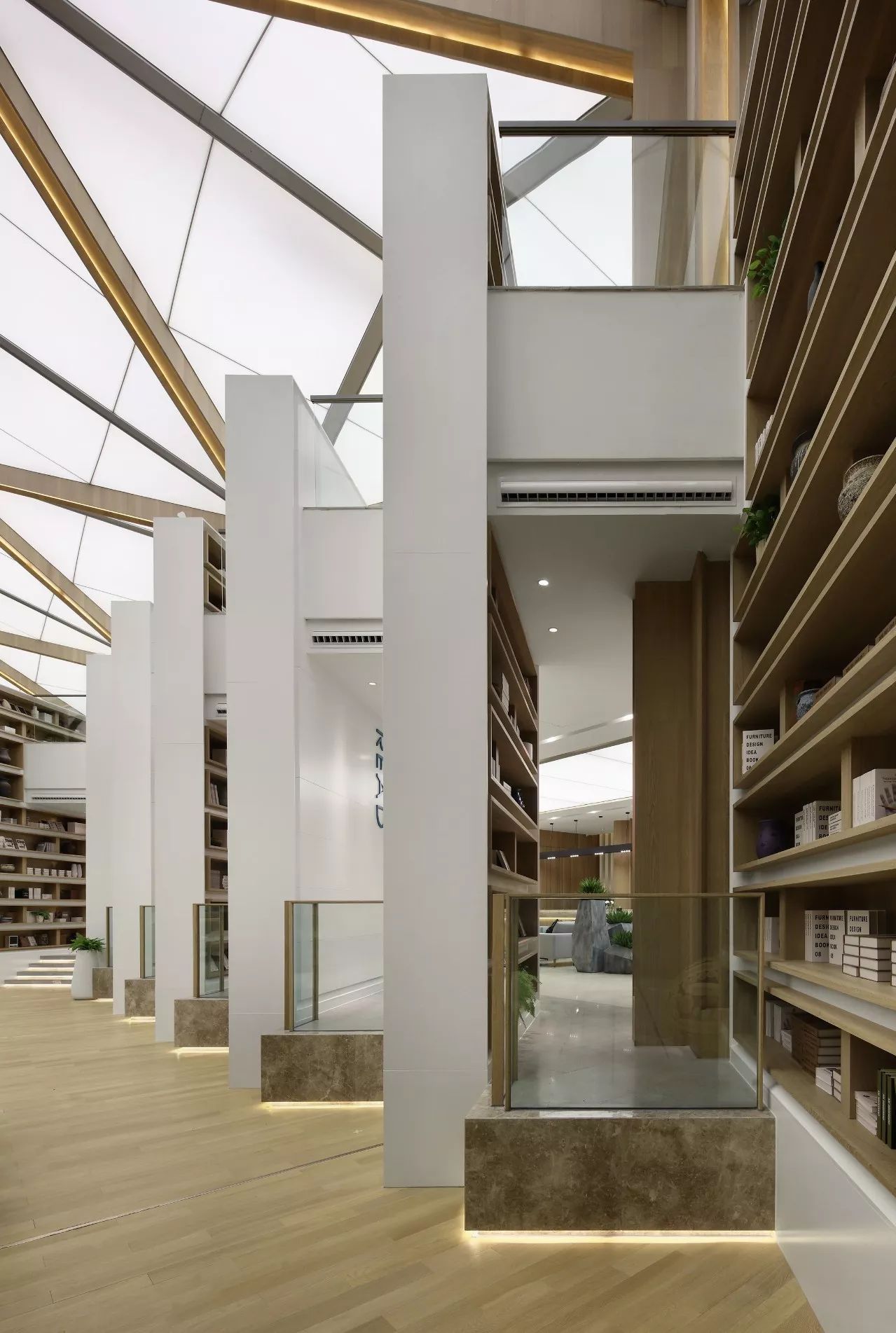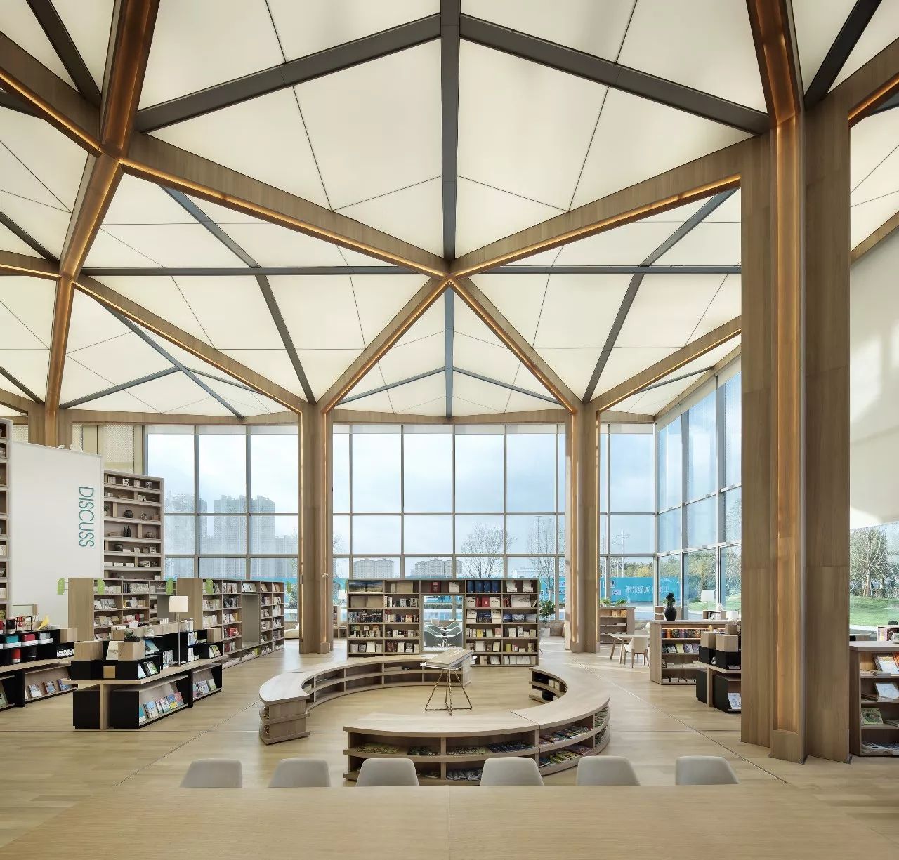 與建筑外觀一脈相承的幾何元素依然是室內(nèi)空間的主要元素,運用幾何韻律的書架、屋頂及桌椅藝術(shù)造型來塑造意境,譜寫出一派前衛(wèi)、自然、輕盈的韻律。溫潤的實木和通透的玻璃構(gòu)成視覺的主流,無論是自然光或是燈光投射,都能勾勒出如繪畫一般的光影。