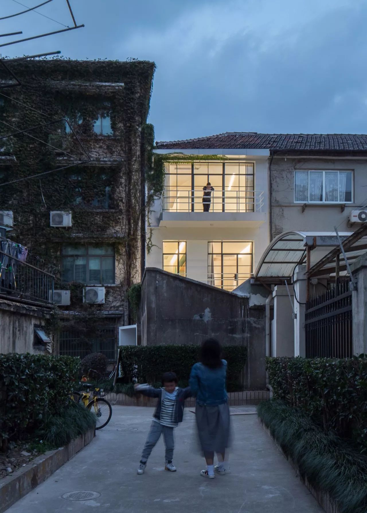 在上海一個普通舊里弄之中,設(shè)計師設(shè)計了這個三層白色的住宅。
